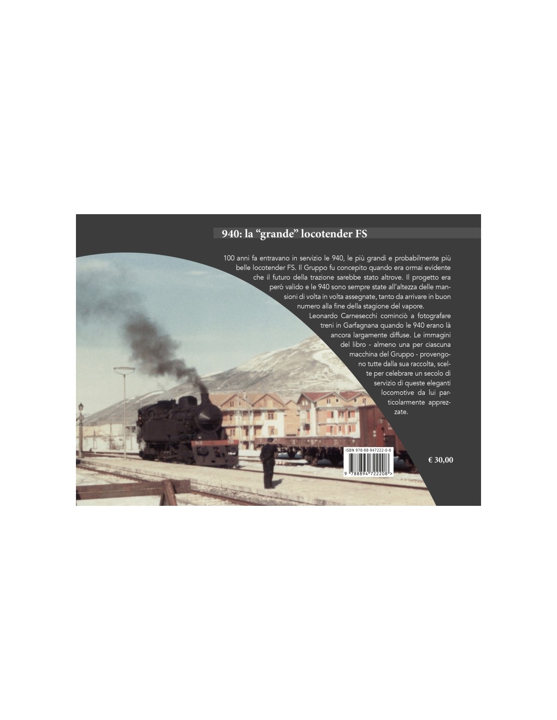 Leonardo Carnesecchi cominciò a fotografare treni in Garfagnana quando le 940 erano là ancora largamente diffuse. Le immagini del libro - almeno una per ciascuna macchina del Gruppo - provengono tutte dalla sua raccolta, scelte per celebrare un secolo di servizio di queste eleganti locomotive da lui particolarmente apprezzate.